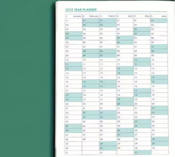 Su diseño minimalista y a doble página te permite ver todo el año de un vistazo, facilitando la planificando a largo plazo.
