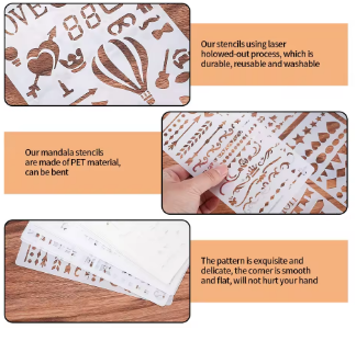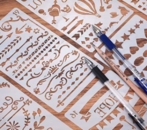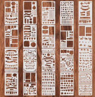 Cada plantilla está fabricada en plástico resistente y reutilizable, con cortes precisos que permiten dibujar fácilmente formas, letras y elementos decorativos.